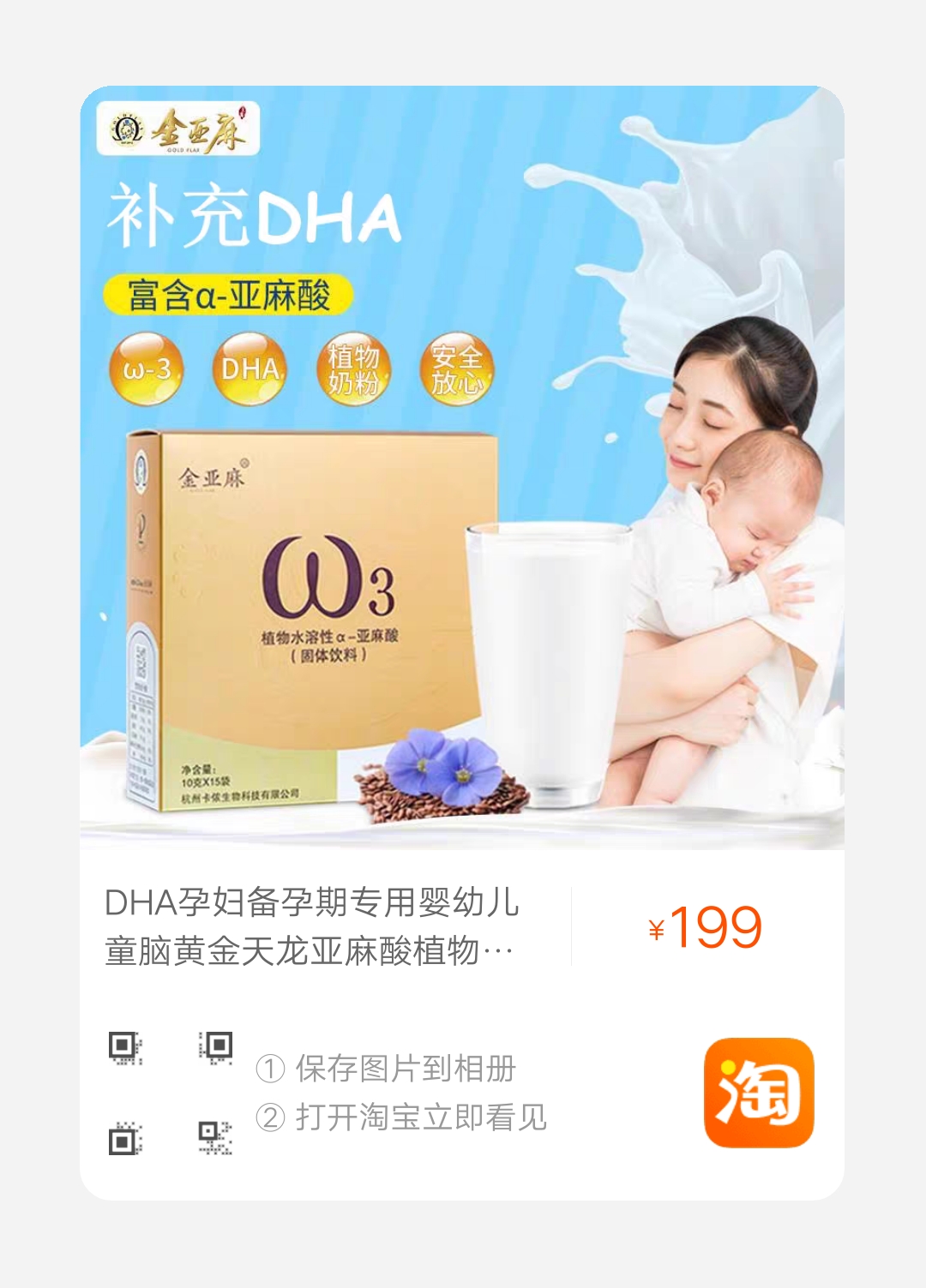 需要注意的是,随着海洋和地下水的污染,海鱼和淡水鱼体内重金属含量高,建议给胎儿和婴幼儿选择补充DHA的食物,最好选择富含α-亚麻酸的营养品,如金亚麻速溶粉。